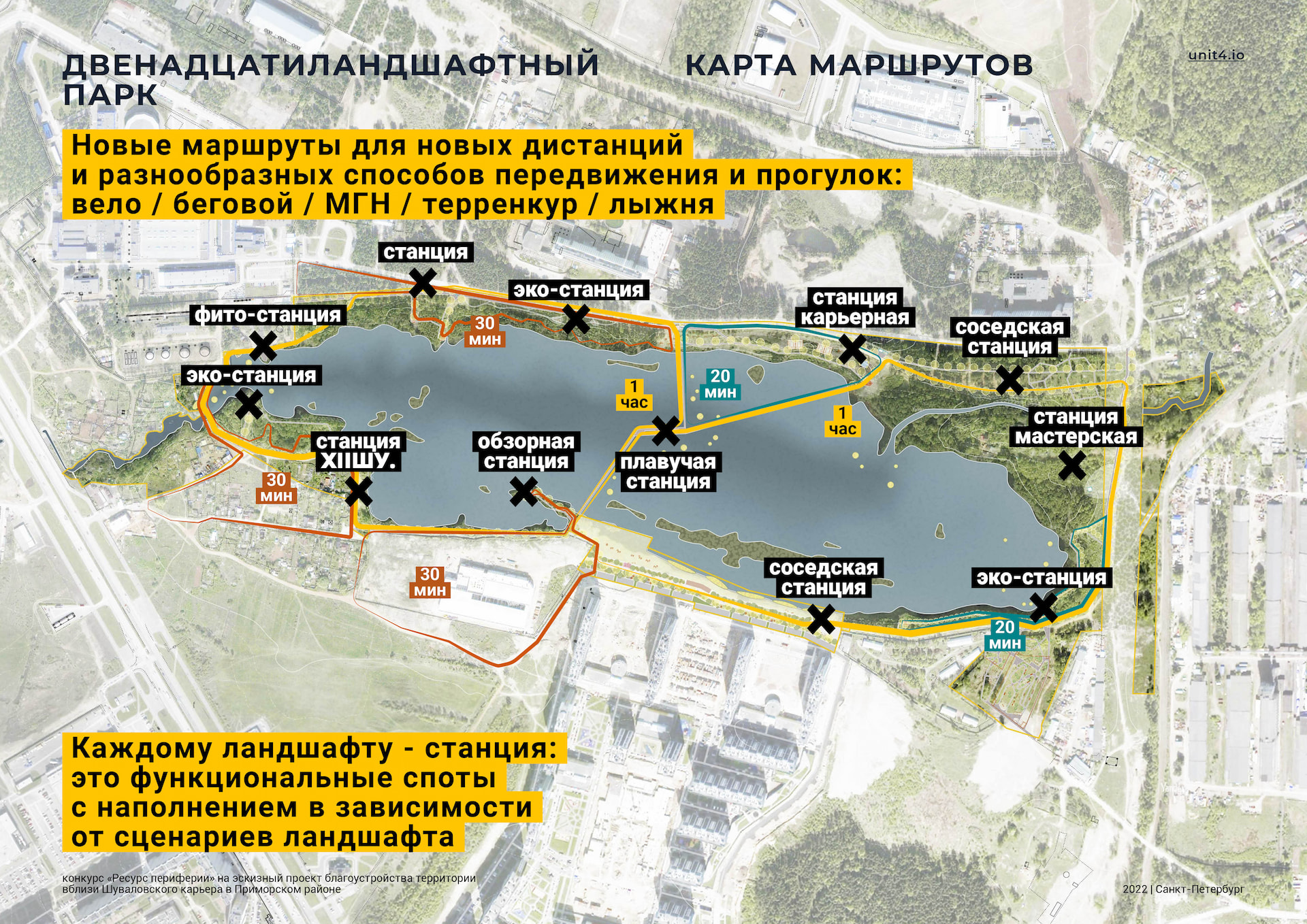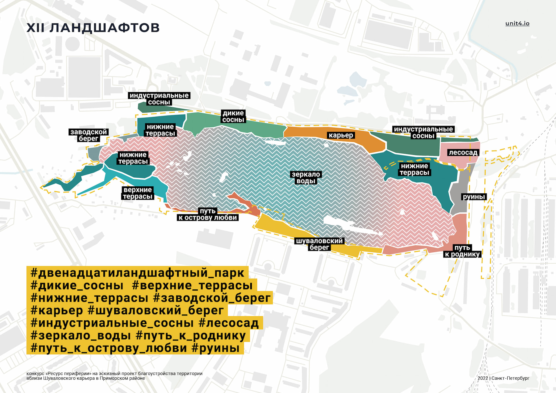 Проект создан в рамках архитектурно-градостроительного конкурса на эскизный проект благоустройства территории вблизи Шуваловского карьера. Конкурс проводился совместно с Комитетом по благоустройству Санкт-Петербурга, Центром компетенций по вопросам формирования комфортной городской среды в Санкт-Петербурге и администрацией Приморского района.